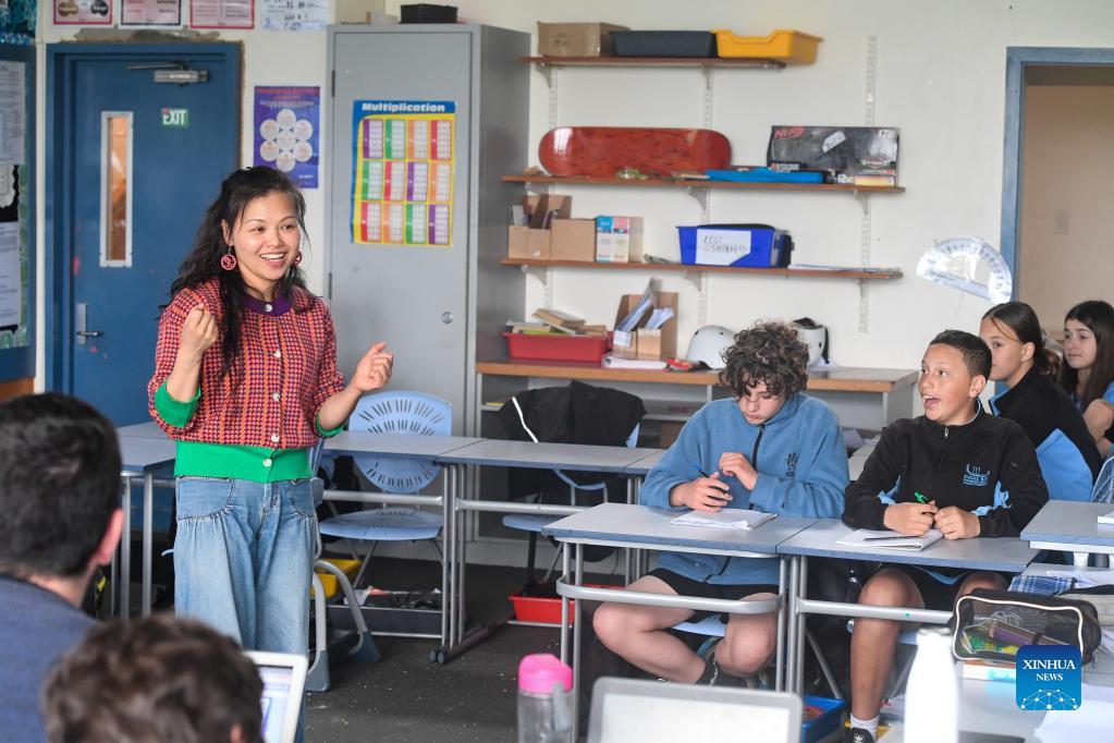 Students attend a Chinese class at Evans Bay Intermediate School in Wellington, New Zealand, Sept. 27, 2021. The opening reception of New Zealand Chinese Language Week was held on Monday evening at the Beehive, the Executive Wing of the parliamentary complex in Wellington. From Sunday to Saturday, New Zealand will host a variety of colorful activities such as learning Chinese language and Chinese Kungfu, enjoying Chinese folk music, experiencing Chinese cuisine, Chinese calligraphy workshops, and Chinese lion dance performances. (Xinhua/Guo Lei)