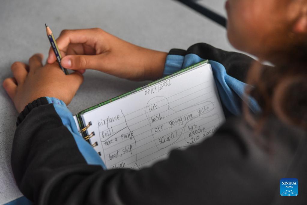 A student attends a Chinese class at Evans Bay Intermediate School in Wellington, New Zealand, Sept. 27, 2021. The opening reception of New Zealand Chinese Language Week was held on Monday evening at the Beehive, the Executive Wing of the parliamentary complex in Wellington. From Sunday to Saturday, New Zealand will host a variety of colorful activities such as learning Chinese language and Chinese Kungfu, enjoying Chinese folk music, experiencing Chinese cuisine, Chinese calligraphy workshops, and Chinese lion dance performances. (Xinhua/Guo Lei)