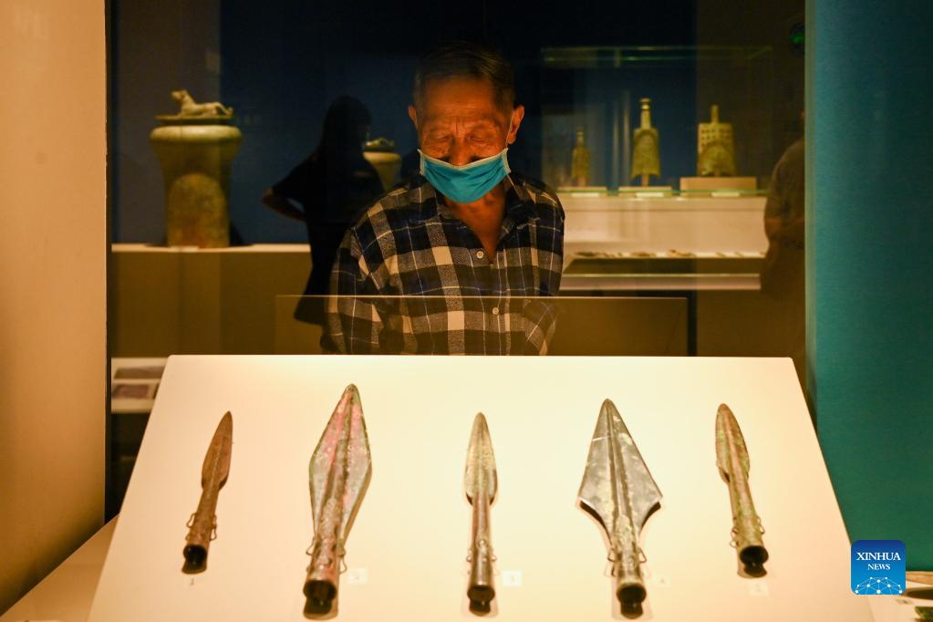 A visitor views exhibits at an exhibition featuring Bronze Age civilizations along the Yangtze River at Sichuan Museum in Chengdu, southwest China's Sichuan Province, Sept. 28, 2021. (Xinhua/Xu Bingjie)