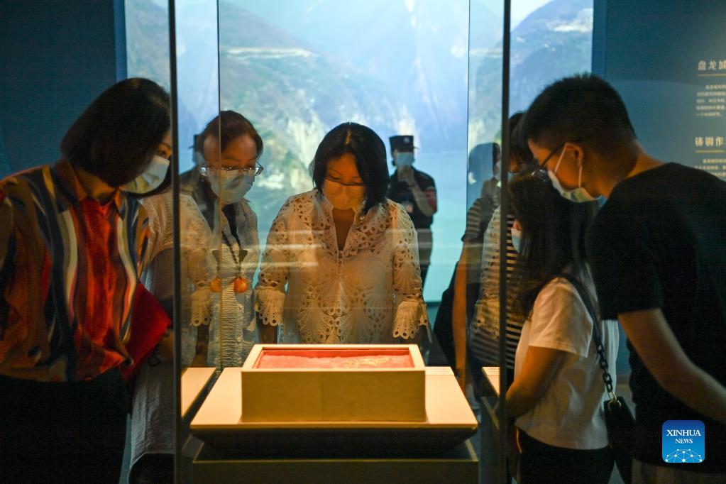 Visitors view an exhibit at an exhibition featuring Bronze Age civilizations along the Yangtze River at Sichuan Museum in Chengdu, southwest China's Sichuan Province, Sept. 28, 2021. (Xinhua/Xu Bingjie)