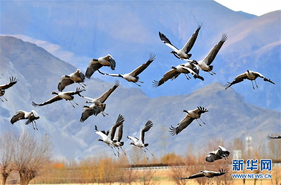 Black-necked cranes fly in the Lhasa River valley in Lhasa, southwest China's Tibet Autonomous Region. (Photo/Xinhua)