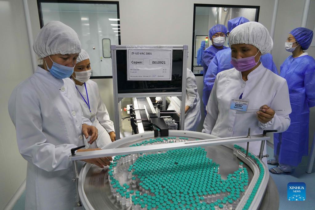 Staff members work on a production line of COVID-19 vaccine at Uzbek pharma Jurabek Laboratories in Uzbekistan, on Sept. 5, 2021. A production line of ZF-UZ-VAC2001 vaccine, jointly developed by the Institute of Microbiology of the Chinese Academy of Sciences and China's Anhui Zhifei Longcom Biopharmaceutical Co., Ltd, has been put into production recently at Uzbek pharma Jurabek Laboratories. Earlier, Jurabek Laboratories has agreed with Anhui Zhifei Longcom Biopharmaceutical on the local production of the ZF-UZ-VAC2001 vaccine, according to a decree signed by Uzbek Prime Minister Abdulla Aripov. (Photo by Zafar Khalilov/Xinhua)