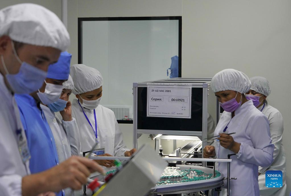 Staff members work on a production line of COVID-19 vaccine at Uzbek pharma Jurabek Laboratories in Uzbekistan, on Sept. 5, 2021. A production line of ZF-UZ-VAC2001 vaccine, jointly developed by the Institute of Microbiology of the Chinese Academy of Sciences and China's Anhui Zhifei Longcom Biopharmaceutical Co., Ltd, has been put into production recently at Uzbek pharma Jurabek Laboratories. Earlier, Jurabek Laboratories has agreed with Anhui Zhifei Longcom Biopharmaceutical on the local production of the ZF-UZ-VAC2001 vaccine, according to a decree signed by Uzbek Prime Minister Abdulla Aripov. (Photo by Zafar Khalilov/Xinhua)