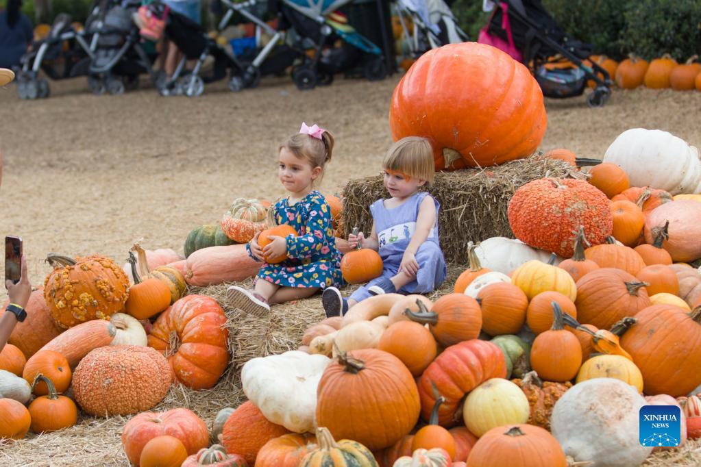 Children are seen among pumpkins at Arboretum's Pumpkin Village in Dallas, Texas, the United States, Sept. 28, 2021. The Pumpkin Village returns to Dallas Arboretum with more than 90,000 pumpkins, gourds and squash. This year's theme is "Bugtopia". (Photo by Tian Dan/Xinhua)
