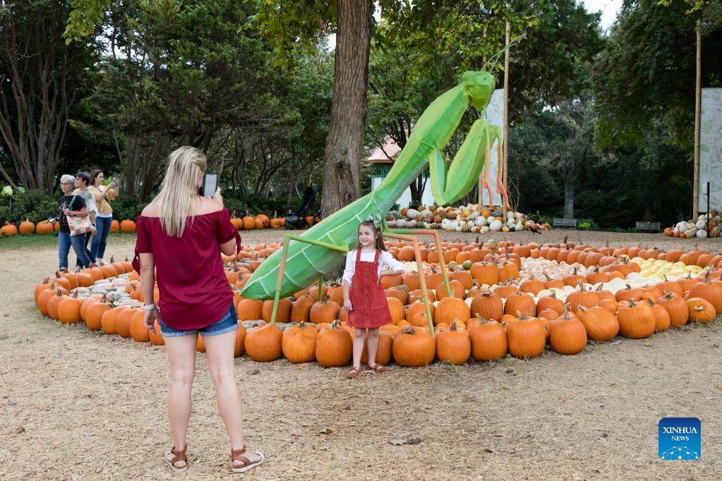 People take photos at Arboretum's Pumpkin Village in Dallas, Texas, the United States, Sept. 28, 2021. The Pumpkin Village returns to Dallas Arboretum with more than 90,000 pumpkins, gourds and squash. This year's theme is "Bugtopia". (Photo by Tian Dan/Xinhua)
