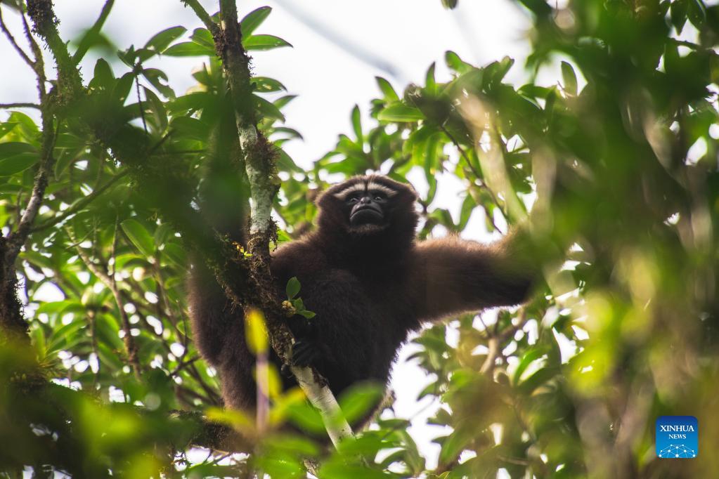 A skywalker gibbon is seen at the Gaoligong Mountain, Baoshan City, southwest China's Yunnan Province, Sept. 28, 2021. Skywalker gibbon, a typical arboreal animal, is one of the national key protected wild animals, mainly found in Gaoligong Mountain. (Xinhua/Wang Guansen)