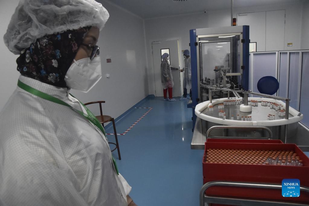Staff members work at a joint venture between China's biopharmaceutical firm Sinovac Biotech and Algeria's pharmaceutical group Saidal in the province of Constantine, Algeria, on Sept. 29, 2021. Algeria on Wednesday started manufacturing the Sinovac COVID-19 vaccines at a joint venture with China, which is located in the eastern province of Constantine. (Xinhua)