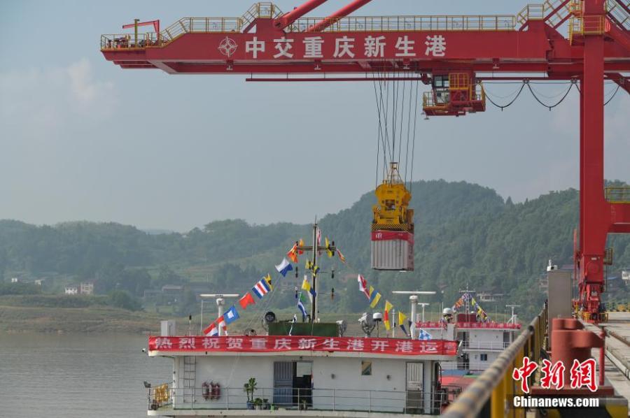 Chongqing Xinsheng Port, the first 10,000-metric-ton port in the upper reaches of the Yangtze River, starts operations on Sept. 29, 2021. (China News Service/He Penglei)