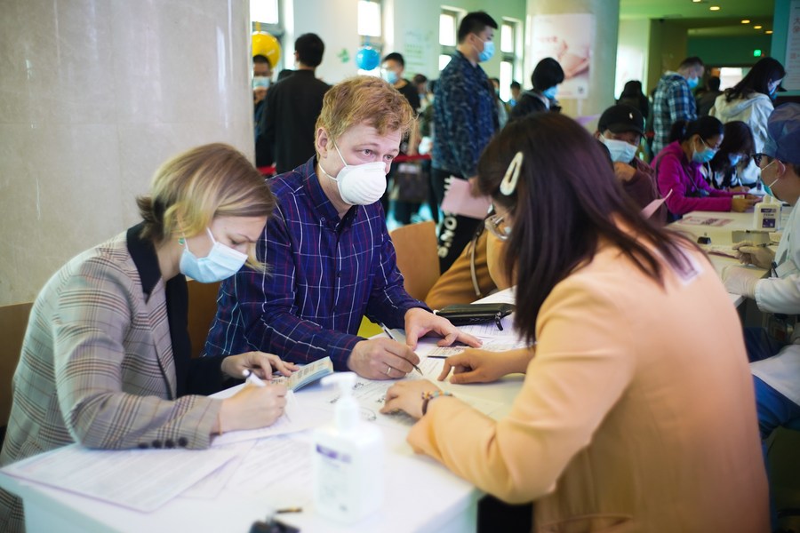 Foreign nationals register for COVID-19 vaccination at a vaccination site in Beijing, capital of China, April 15, 2021. (Xinhua/Peng Ziyang)
