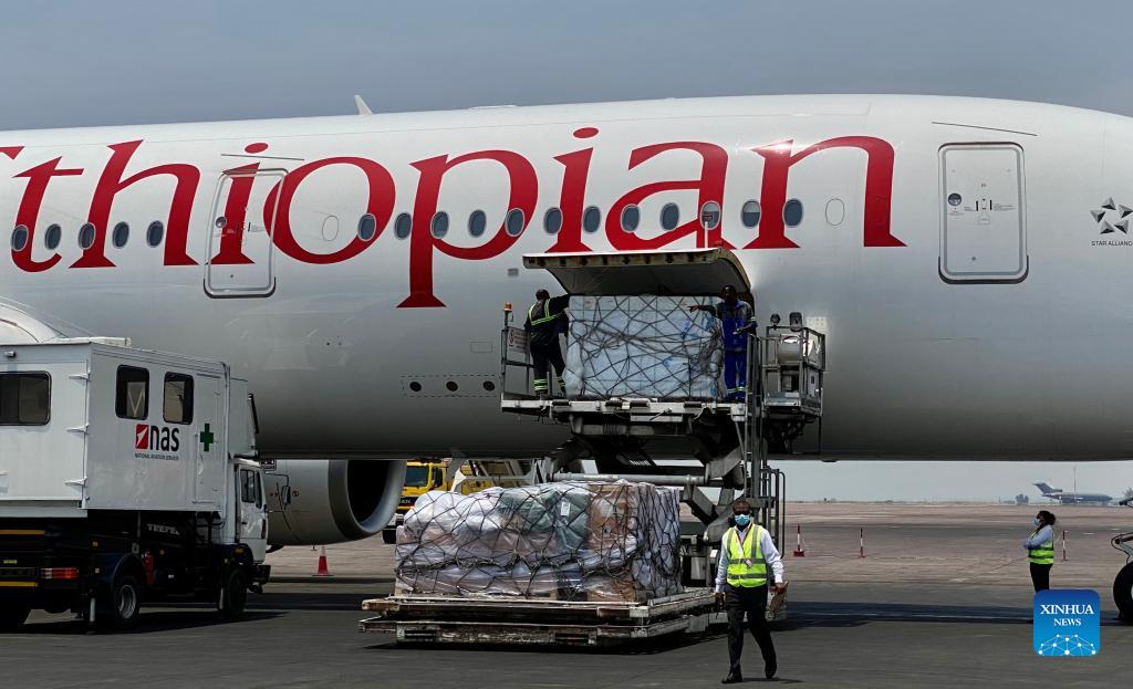 Workers unload a batch of Chinese Sinovac COVID-19 vaccines at the N'djili Airport in Kinshasa, Democratic Republic of the Congo (DRC), Sept. 29, 2021. The Democratic Republic of the Congo (DRC) on Wednesday received a batch of Chinese Sinovac COVID-19 vaccines offered by the Chinese government at the N'djili Airport in the capital city Kinshasa. (Photo by Alain Uyakani/Xinhua)