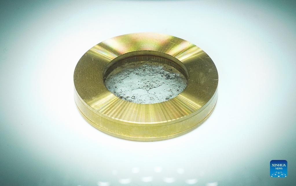 Photo taken on Sept. 26, 2021 shows the lunar soil brought back by China's moon mission during the 13th China International Aviation and Aerospace Exhibition, or Airshow China 2021, in Zhuhai, south China's Guangdong Province. (Xinhua/Liu Dawei)