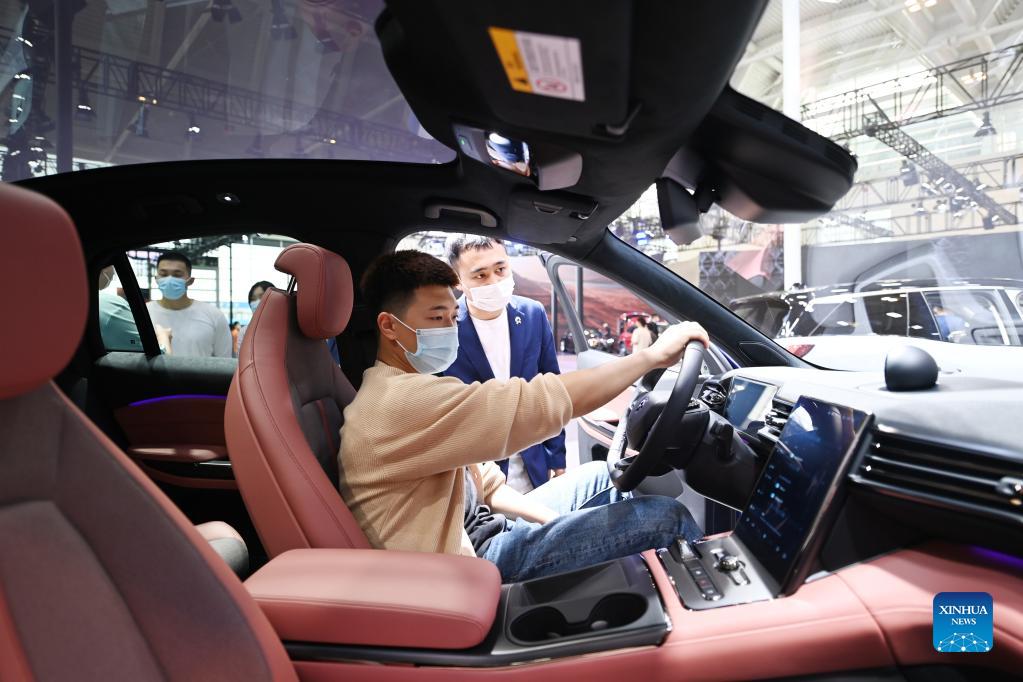 A visitor experiences a car from Chinese electric automaker Nio during China (Tianjin) Auto Show 2021 in north China's Tianjin, Sept. 29, 2021. China (Tianjin) Auto Show 2021 kicked off Wednesday in Tianjin. The seven-day event attracts a large number of well-known automobile makers both home and abroad. (Xinhua/Li Ran)