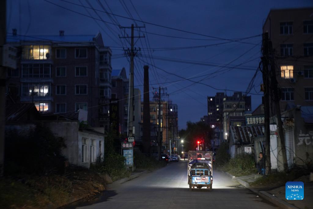 Deliveryman Li Yang rides his tricycle home in Bayan County of Harbin, northeast China's Heilongjiang Province, Sept. 26, 2021. Since the latest COVID-19 resurgence in Bayan County, local authorities have prioritized delivery services to ensure the supply of necessities. Couriers like Li Yang are working day and night to deliver food items and medical supplies to the residents under closed-off management. (Xinhua/Wang Jianwei)