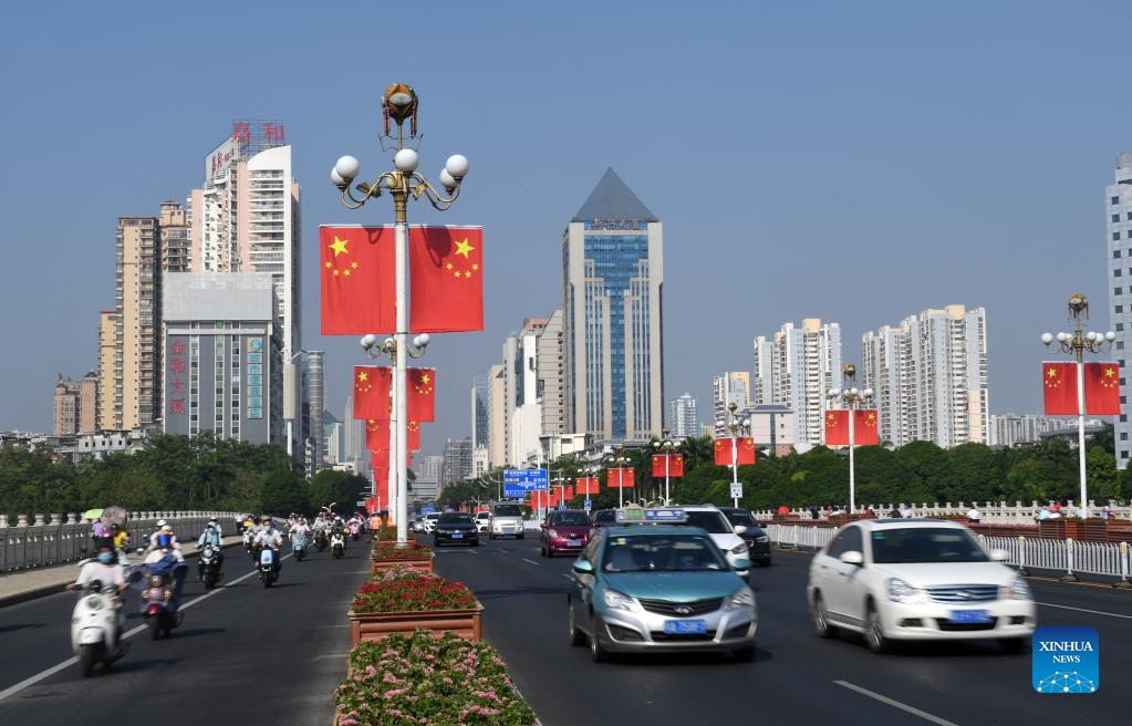 Vehicles run on the Nanhu Bridge in Nanning, south China's Guangxi Zhuang Autonomous Region, Sept. 29, 2021. Streets in Nanning are decorated with national flags to celebrate the upcoming National Day. (Xinhua/Lu Boan)