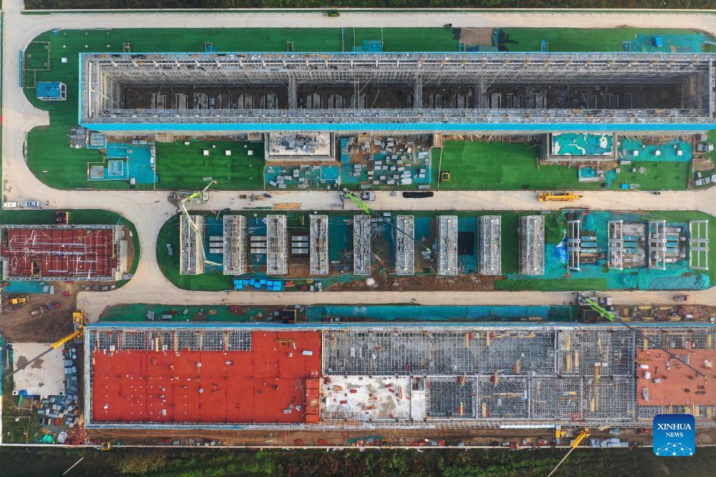 Aerial photo taken on Sept. 29, 2021 shows workers working at a construction site of the 500-KV Xiongdong electricity substation in north China's Hebei Province. Xiongdong substation, the first 500-KV substation of Xiongan New Area, is scheduled to be put into operation in 2022, with a total investment of 460 million yuan (about 71.14 million U.S. dollars). (Xinhua/Xing Guangli)