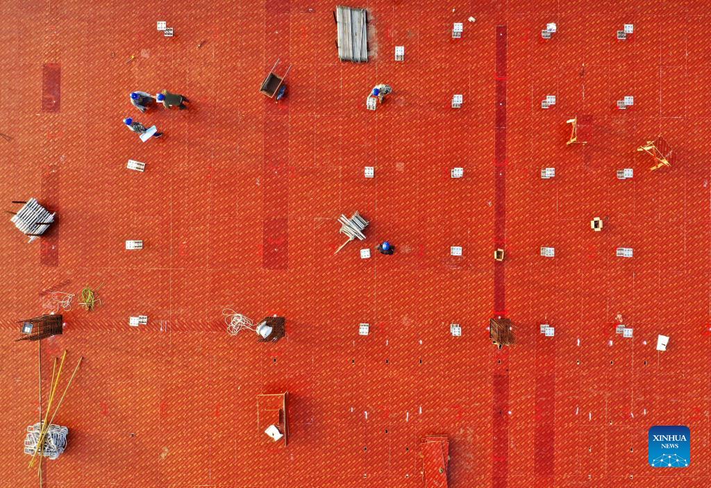 Aerial photo taken on Sept. 29, 2021 shows workers working at a construction site of the 500-KV Xiongdong electricity substation in north China's Hebei Province. Xiongdong substation, the first 500-KV substation of Xiongan New Area, is scheduled to be put into operation in 2022, with a total investment of 460 million yuan (about 71.14 million U.S. dollars). (Xinhua/Xing Guangli)