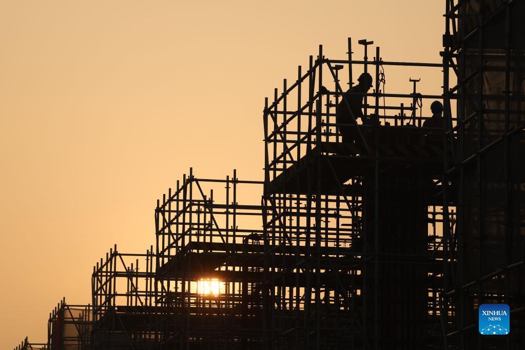 Workers work at a construction site of the 500-KV Xiongdong electricity substation in north China's Hebei Province, Sept. 29, 2021. Xiongdong substation, the first 500-KV substation of Xiongan New Area, is scheduled to be put into operation in 2022, with a total investment of 460 million yuan (about 71.14 million U.S. dollars). (Xinhua/Xing Guangli)