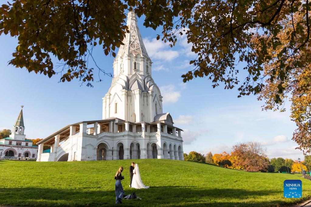 A couple poses for a photo in front of the Church of the Ascension in Kolomenskoye park in Moscow, Russia, on Sept. 29, 2021. (Xinhua/Bai Xueqi)