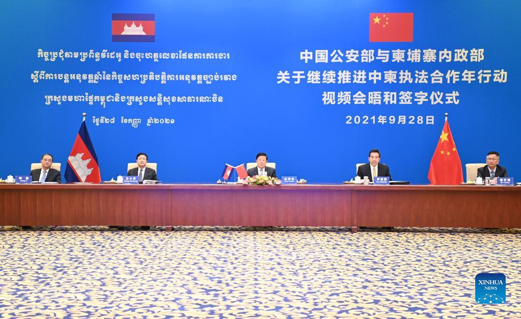 BEIJING, Sept. 29 (Xinhua) -- Chinese State Councilor and Minister of Public Security Zhao Kezhi and Cambodian Deputy Prime Minister and Interior Minister Sar Kheng on Tuesday attended a virtual meeting on promoting the Year of Law Enforcement Cooperation between the two countries.