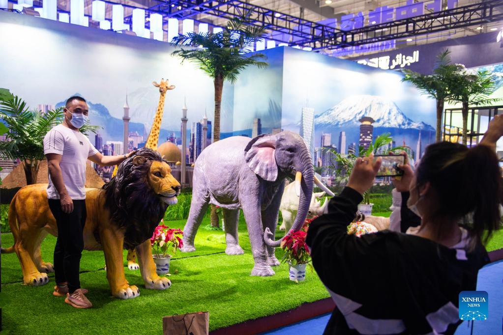 Visitors take photos during the Second China-Africa Economic and Trade Expo in Changsha, capital of central China's Hunan Province, Sept. 29, 2021. The second China-Africa Economic and Trade Expo closed on Wednesday. The four-day event, held both online and offline and themed "New Start, New Opportunities, and New Accomplishments," attracted nearly 900 enterprises from nearly 40 African countries and China, according to the organizers. (Xinhua/Chen Sihan)