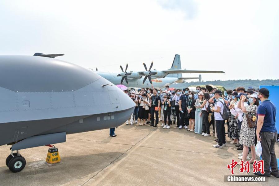 WuZhen-7 Unmanned Reconnaissance Aerial Vehicle attracts the teenage team from Hong Kong and Macao SAR during the 13th China International Aviation and Aerospace Exhibition in the southern Chinese city of Zhuhai, Guangdong Province, Sept. 29, 2021. (China News Service/Chen Jimin)
