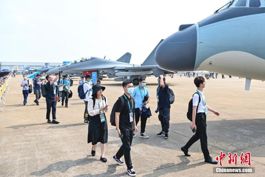Teenagers from Hong Kong and Macao SAR visit the static display area in the 13th China International Aviation and Aerospace Exhibition in the southern Chinese city of Zhuhai, Guangdong Province, Sept. 29, 2021. (China News Service/Chen Jimin)