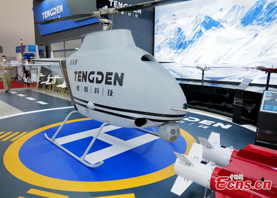 TH145, an unmanned aerial vehicle(UAV) with a range of 700 kilometers, is exhibited during the 13th China International Aviation and Aerospace Exhibition in the southern Chinese city of Zhuhai, Guangdong Province, Sept. 29, 2021. (China News Service/Chen Wen)