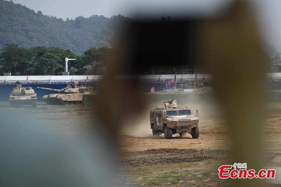 The ground equipment presents dynamic demonstrations during the 13th China International Aviation and Aerospace Exhibition in the southern Chinese city of Zhuhai, Guangdong Province, Sept. 29, 2021. (China News Service/Chen Chuhong)