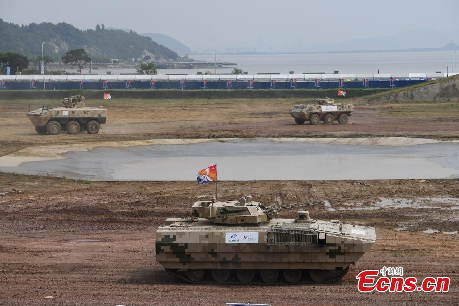 The ground equipment presents dynamic demonstrations during the 13th China International Aviation and Aerospace Exhibition in the southern Chinese city of Zhuhai, Guangdong Province, Sept. 29, 2021. (China News Service/Chen Chuhong)