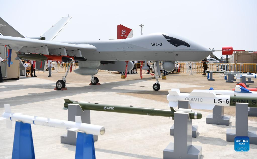 Photo taken on Sept. 28, 2021 shows an unmanned aerial vehicle (UAV) displayed at the 13th China International Aviation and Aerospace Exhibition, or Airshow China 2021, in Zhuhai, south China's Guangdong Province. (Xinhua/Deng Hua)
