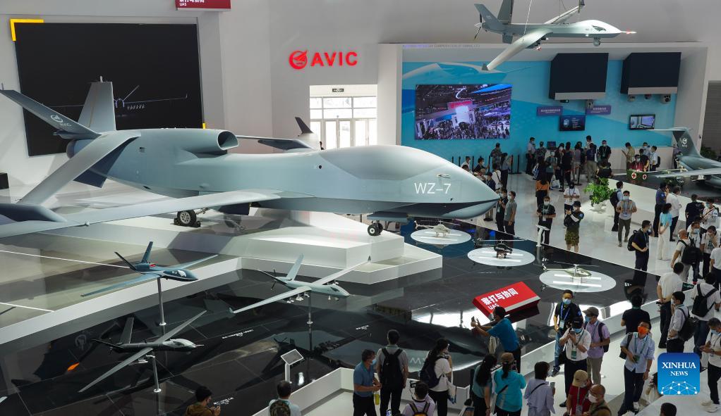 Photo taken on Sept. 29, 2021 shows a WZ-7 unmanned aerial vehicle (UAV) for surveillance purposes displayed at the 13th China International Aviation and Aerospace Exhibition, or Airshow China 2021, in Zhuhai, south China's Guangdong Province. (Xinhua/Liu Dawei)