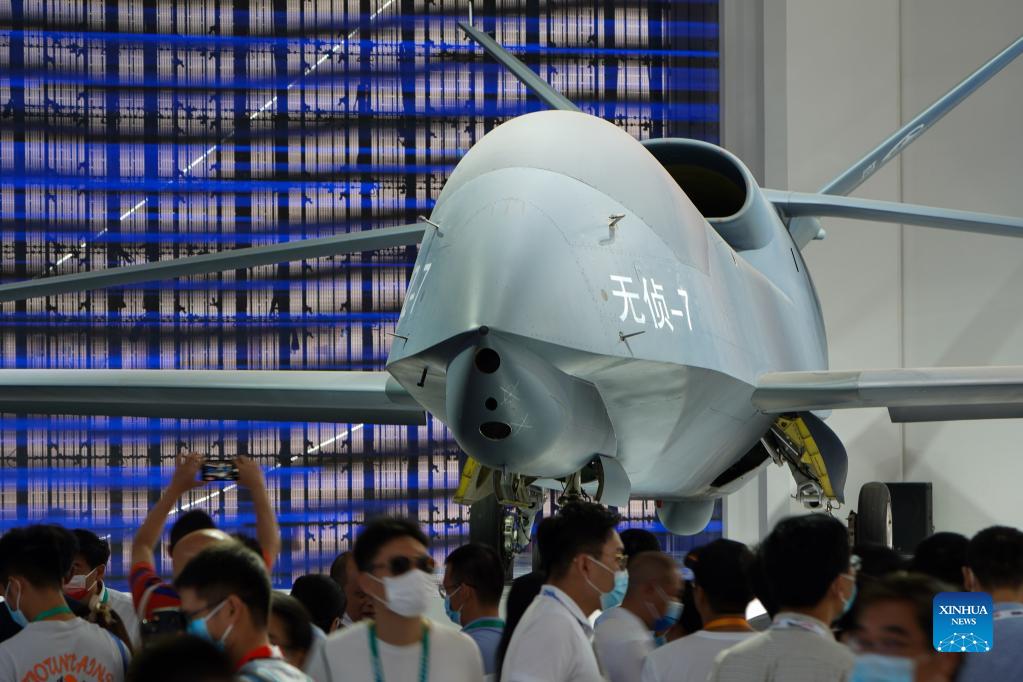Photo taken on Sept. 29, 2021 shows a WZ-7 unmanned aerial vehicle (UAV) for surveillance purposes displayed at the 13th China International Aviation and Aerospace Exhibition, or Airshow China 2021, in Zhuhai, south China's Guangdong Province. (Xinhua/Liu Dawei)
