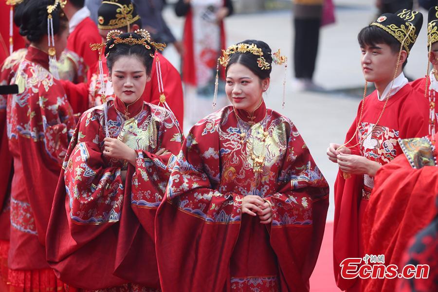 Newlyweds dressed in traditional Han costumes (Hanfu) attend a group wedding ceremony at a historical and cultural park in Xuzhou City, east China's Jiangsu Province, Sept. 29, 2021. (China News Service/Yang Bo)