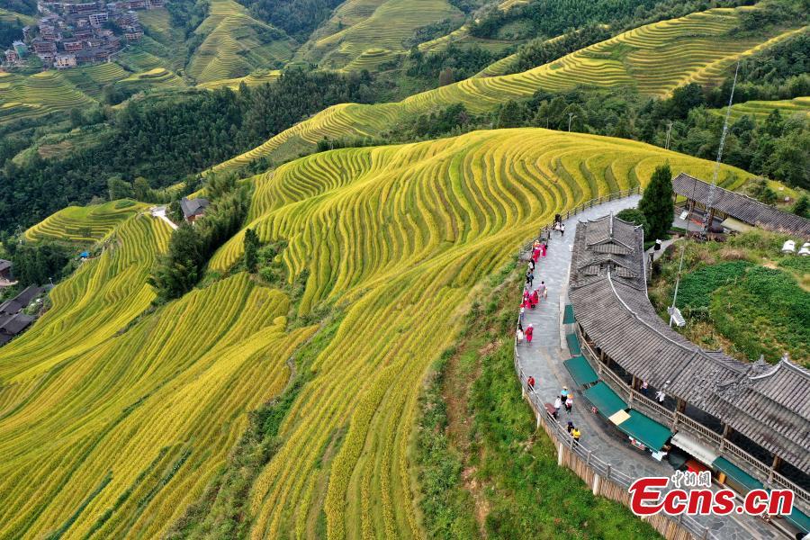 Photo taken on Sept. 29, 2021 shows the breathtaking autumn scenery of the Longji terraced fields blanketed by golden rice paddies in Longsheng County, south China’s Guangxi Zhuang Autonomous Region. (China News Service/Yu Jing)