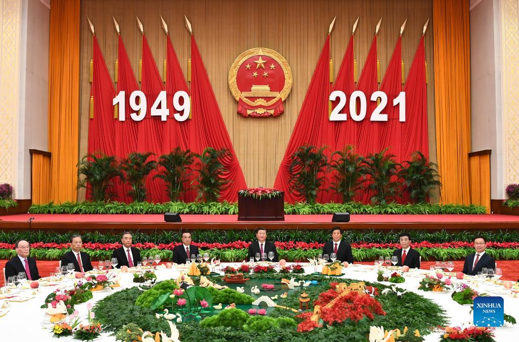 The Communist Party of China and state leaders Xi Jinping, Li Keqiang, Li Zhanshu, Wang Yang, Wang Huning, Zhao Leji, Han Zheng and Wang Qishan, attend a reception to celebrate the 72nd anniversary of the founding of the People's Republic of China along with nearly 500 guests from home and abroad in Beijing, capital of China, Sept. 30, 2021. China's State Council on Thursday held the reception at the Great Hall of the People in Beijing. (Xinhua/Xie Huanchi)