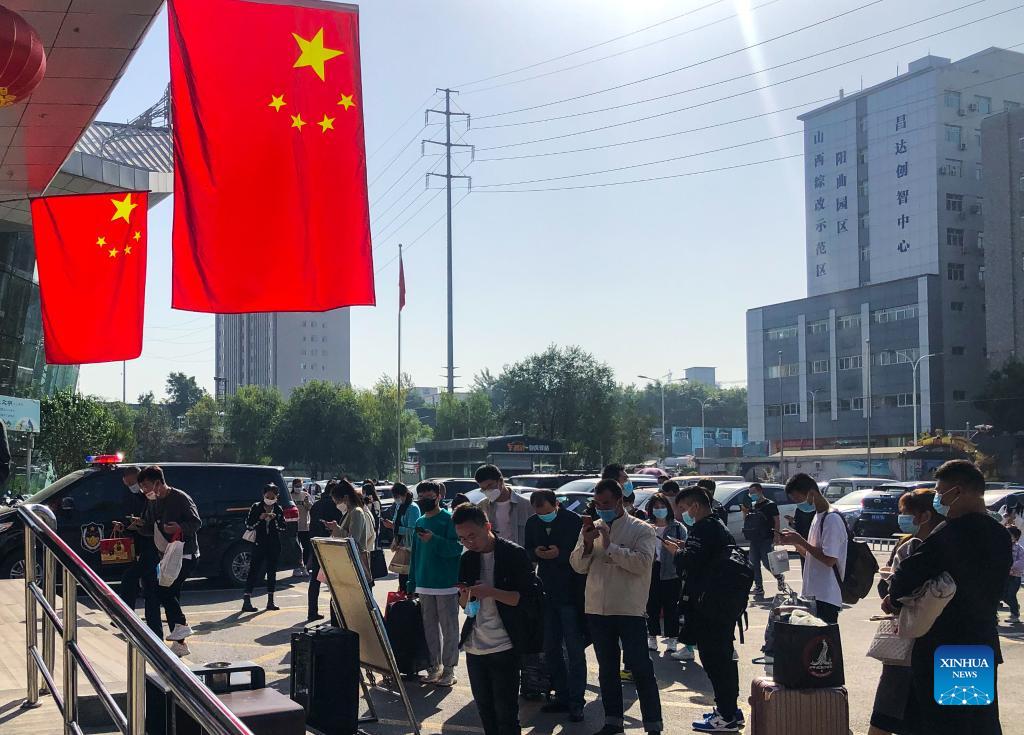 Passengers scan QR codes before entering the Taiyuan East Coach Station in Taiyuan, north China's Shanxi Province, Oct. 1, 2021. (Xinhua/Chai Ting)