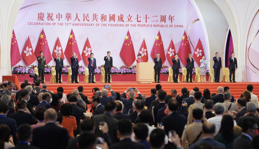 Photo taken on Oct. 1, 2021 shows a reception celebrating the 72nd anniversary of the founding of the People's Republic of China, in Hong Kong, south China. (Xinhua/Lui Siu Wai)
