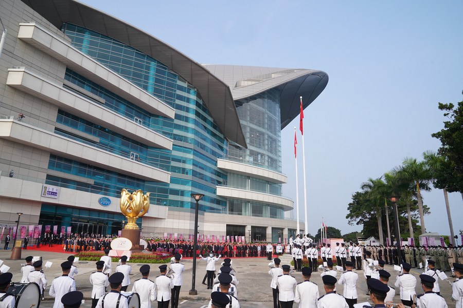 A flag-raising ceremony is held to celebrate the 72nd anniversary of the founding of the People's Republic of China at the Golden Bauhinia Square in Hong Kong, south China, Oct. 1, 2021. (Xinhua/Lui Siu Wai)