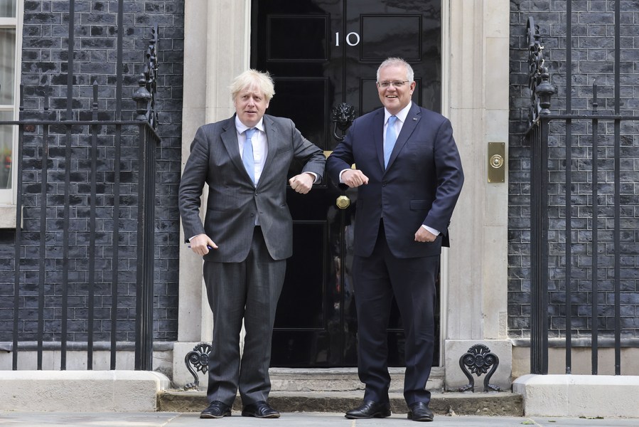 British Prime Minister Boris Johnson (L) greets Australian Prime Minister Scott Morrison in front of 10 Downing Street, in London, Britain, on June 15, 2021.(Tim Hammond/No. 10 Downing Street/Handout via Xinhua)