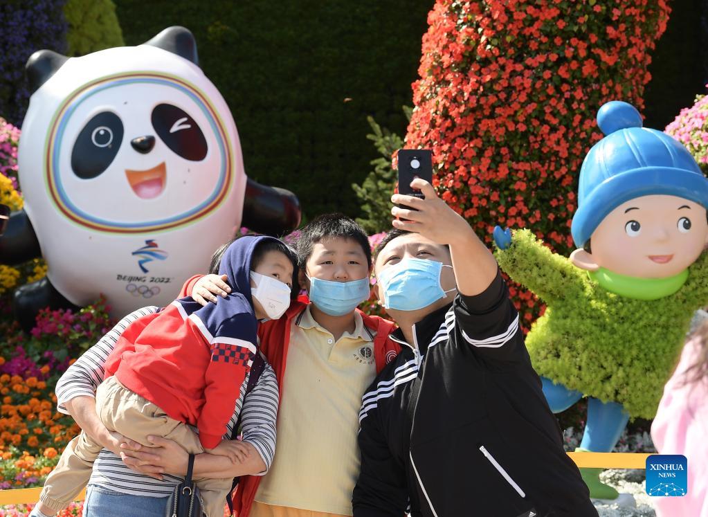 People take a selfie in front of a flowerbed in Beijing, capital of China, Oct. 1, 2021. (Xinhua/Li He)