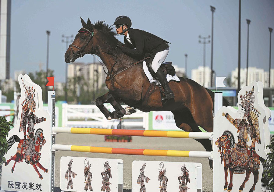 Liang Ruiji of Guangdong province clears a fence during the show jumping competition on Sept 21. XINHUA