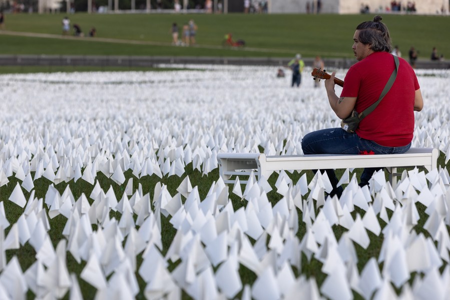 A man sits beside white flags placed on the National Mall to honor the lives lost to COVID-19 in Washington, D.C., the United States, Sept. 18, 2021. (Photo by Aaron Schwartz/Xinhua)
