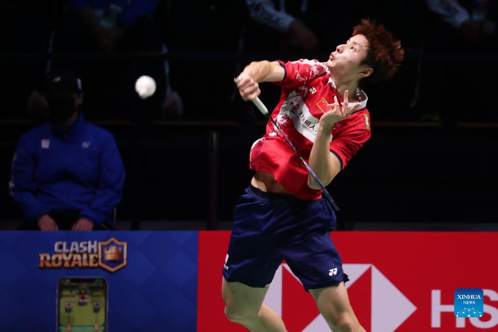 Shi Yuqi of China competes during the men's singles match against Momota Kento of Japan of the final between China and Japan at Badminton Sudirman Cup 2021 in Vantaa, Finland, Oct. 3, 2021. (Photo by Matti Matikainen/Xinhua)