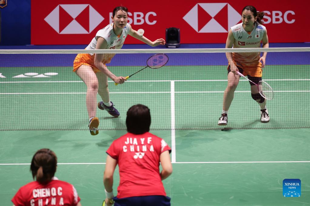Matsumoto Mayu (L top)/Matsutomo Misaki (R top) of Japan compete during the women's doubles match against Chen Qingchen/Jia Yifan of China of the final between China and Japan at Badminton Sudirman Cup 2021 in Vantaa, Finland, Oct. 3, 2021. (Photo by Matti Matikainen/Xinhua)