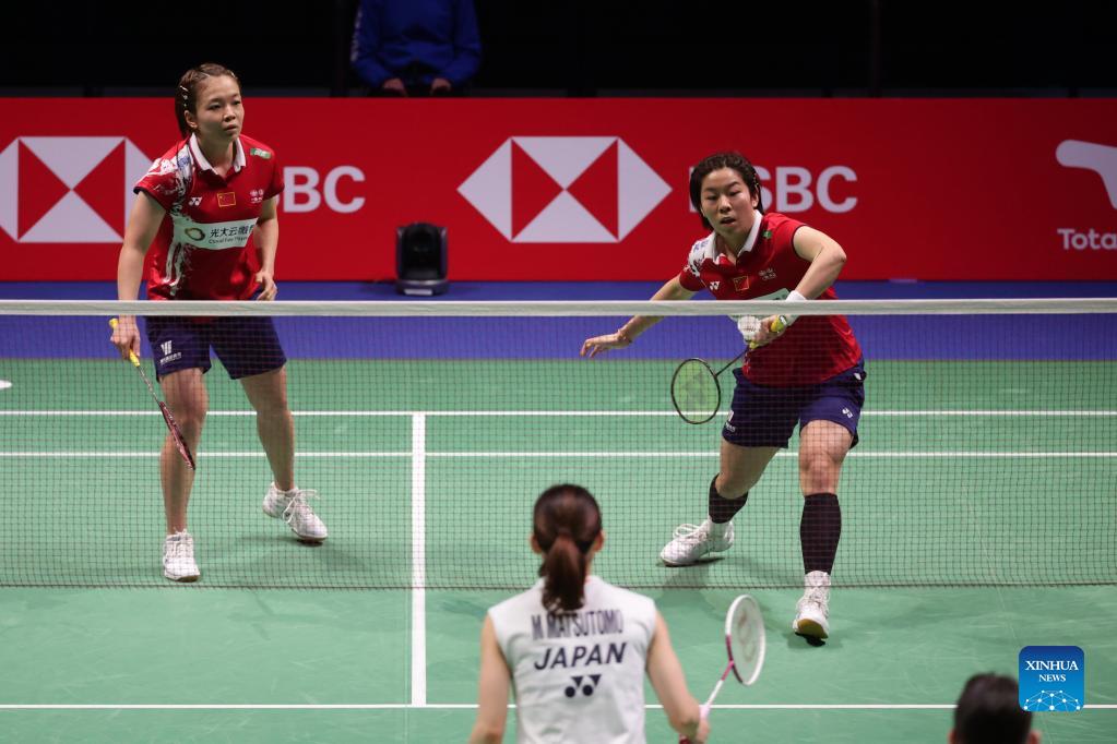 Chen Qingchen/Jia Yifan (R) of China compete during the women's doubles match against Matsumoto Mayu/Matsutomo Misaki of Japan of the final between China and Japan at Badminton Sudirman Cup 2021 in Vantaa, Finland, Oct. 3, 2021. (Photo by Matti Matikainen/Xinhua)