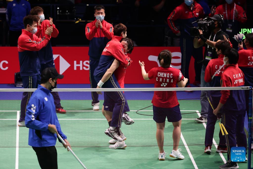 Team China celebrate after winning the final against Japan at Badminton Sudirman Cup 2021 in Vantaa, Finland, Oct. 3, 2021. (Photo by Matti Matikainen/Xinhua)