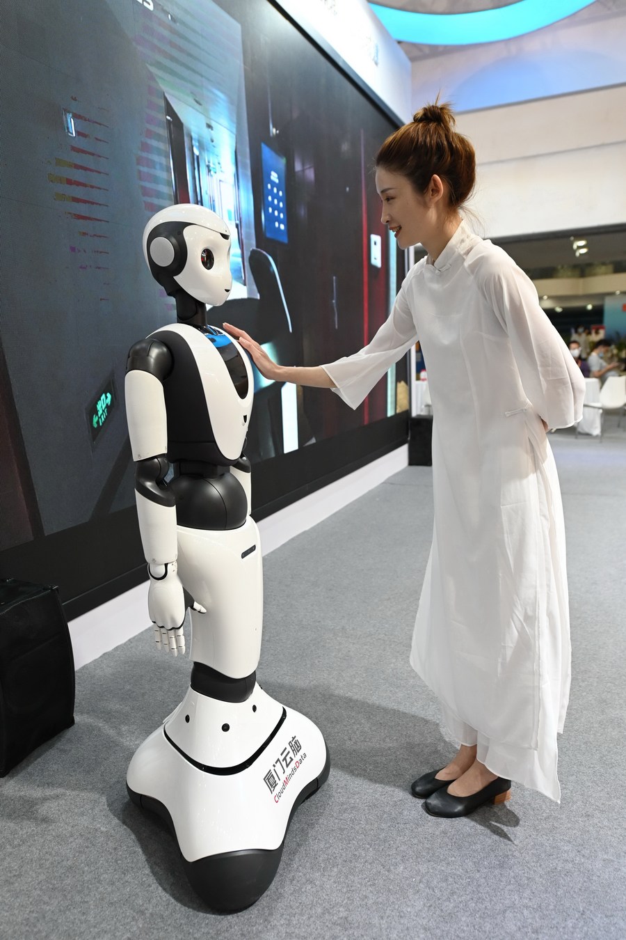 A visitor interacts with a 5G smart service android during the 21st China International Fair for Investment and Trade (CIFIT) in Xiamen, southeast China's Fujian Province, Sept. 8, 2021.(Xinhua/Lin Shanchuan)