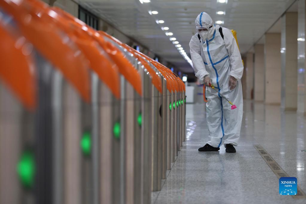 A staff member conducts disinfection at Harbin Railway Station in Harbin, northeast China's Heilongjiang Province, Oct. 2, 2021. Strict epidemic prevention and control measures have been imposed at the city's main shopping malls, tourist attractions and other sites where mass gatherings take place during the ongoing National Day holiday. Many essential workers stick to their posts to conduct temperature checks, health code checks, and disinfection. (Xinhua/Zhang Tao)