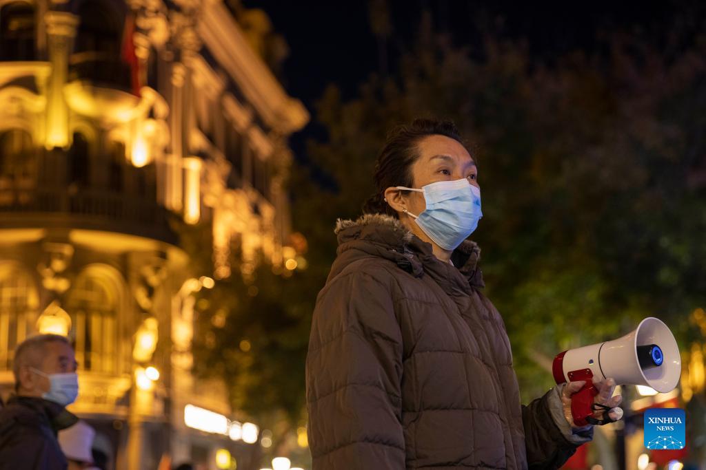 An epidemic prevention worker is seen on duty on the Central Street in Harbin, northeast China's Heilongjiang Province, Oct. 2, 2021. Strict epidemic prevention and control measures have been imposed at the city's main shopping malls, tourist attractions and other sites where mass gatherings take place during the ongoing National Day holiday. Many essential workers stick to their posts to conduct temperature checks, health code checks, and disinfection. (Xinhua/Zhang Tao)