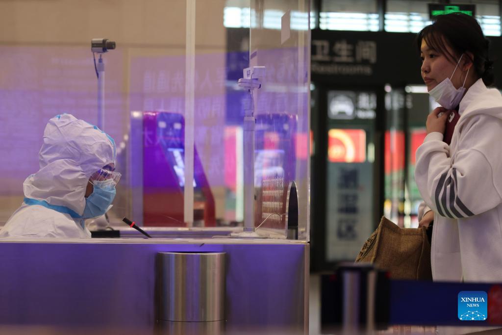 A staff member checks the personal information of a traveler at Harbin Railway Station in Harbin, northeast China's Heilongjiang Province, Oct. 2, 2021. Strict epidemic prevention and control measures have been imposed at the city's main shopping malls, tourist attractions and other sites where mass gatherings take place during the ongoing National Day holiday. Many essential workers stick to their posts to conduct temperature checks, health code checks, and disinfection. (Xinhua/Zhang Tao)